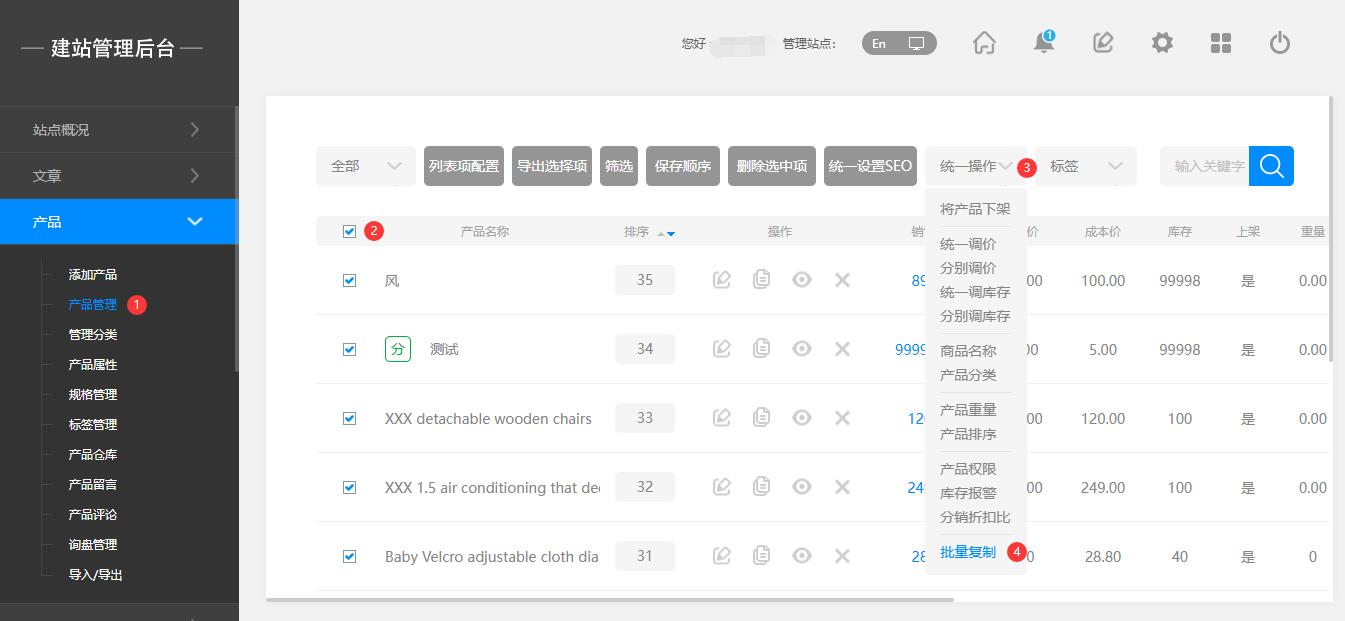 使用场景:不同的语言站点的产品,现在可以通过批操作统一复制后台:产品—产品管理—选择产品—统一操作—批量复制—选择语言站点