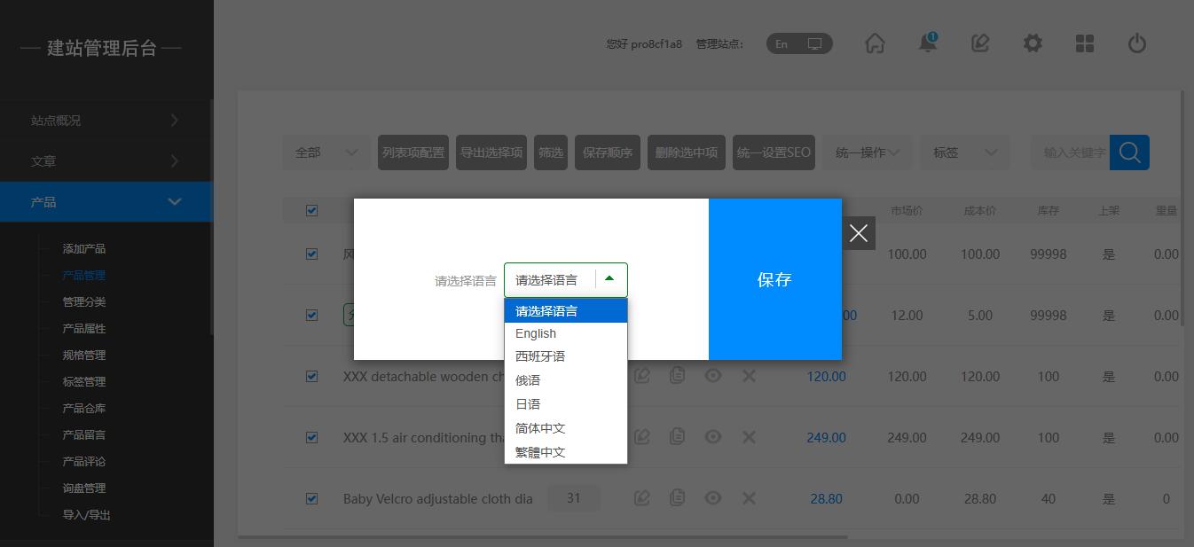 使用场景:不同的语言站点的产品,现在可以通过批操作统一复制后台:产品 — 产品管理 — 选择产品 — 统一操作 — 批量复制 — 选择语言站点